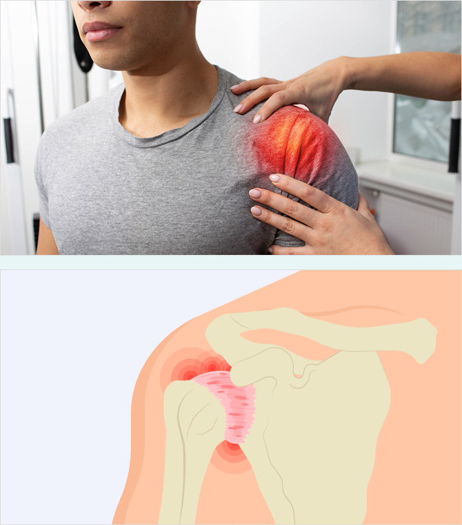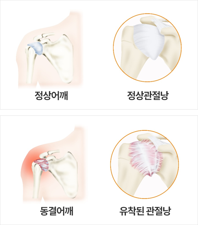 어깨 관절을 둘러싼 관절막이 퇴행성 변화를 일으키면서 염증을 유발하고, 이로 인해 어깨 관절강이 유착되어서 팔을 움직였을 때 통증이 유발되고 운동범위의 제한이 오는 질병입니다.